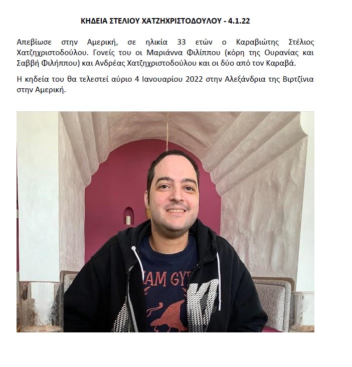 ΤΗΝ ΠΑΡΑΣΚΕΥΗ 28/1/22 ΚΑΙ ΩΡΑ 2.00ΜΜ ΣΤΗΝ ΕΚΚΛΗΣΙΑ ΑΓΙΟΥ ΝΙΚΟΛΑΟΥ ΣΤΑ ΚΑΤΩ ΠΟΛΕΜΙΔΙΑ, ΚΗΔΕΙΑ ΤΗΣ ΚΑΡΑΒΙΩΤΙΣΣΑΣ ΣΤΑΥΡΟΥΛΑΣ ΞΕΝΟΦΩΝΤΟΣ, ΗΛΙΚΙΑΣ 76 ΕΤΩΝ.