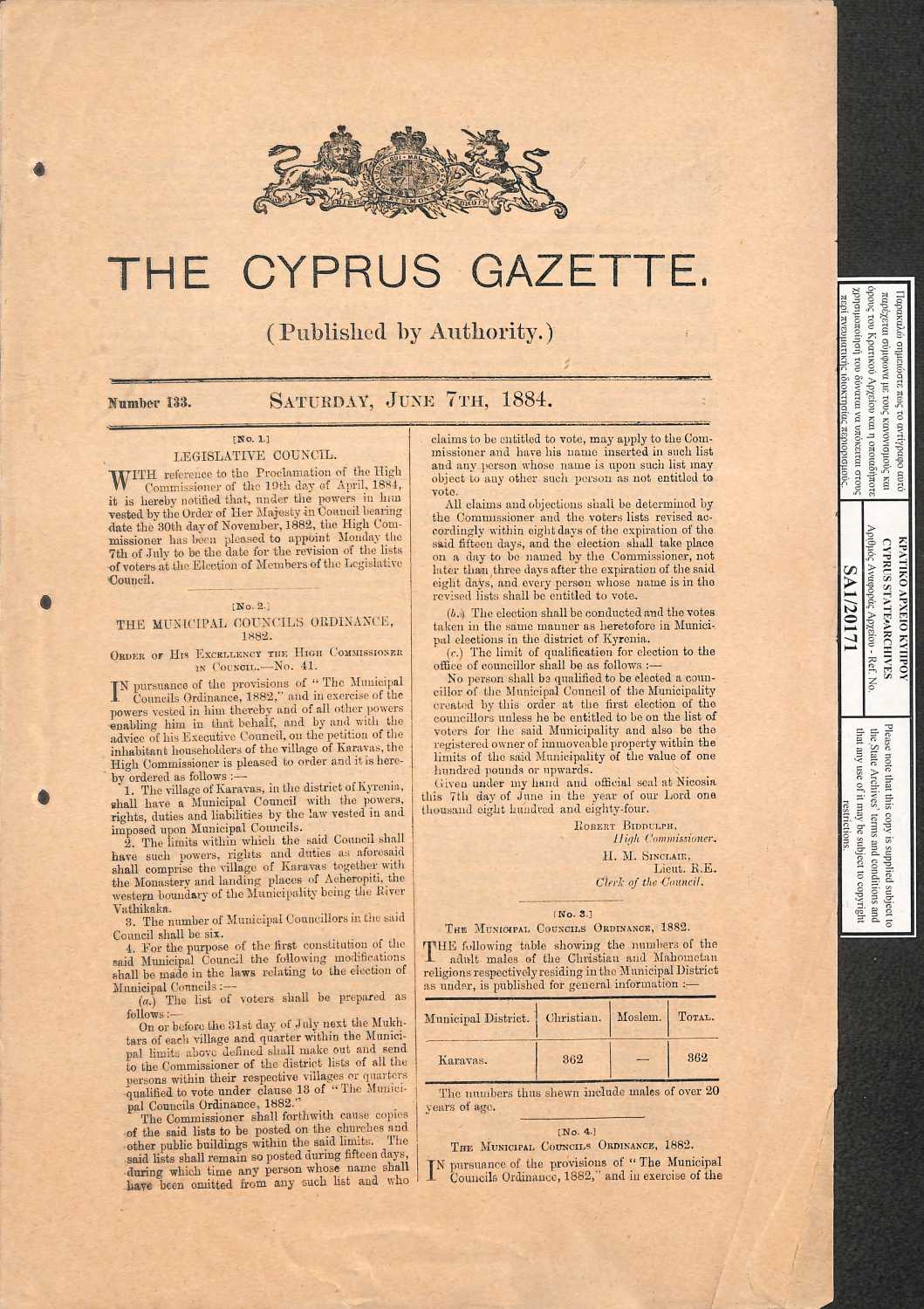 - Ο Μέγας Αρμοστής ευηρεστήθη να διατάξη και δη διά της παρούσης διατάττεται όπως τα μέλη του χωρίου Καραβά απαρτισθησομένου Δημοτικού Συμβουλίου ώσιν έξ τον αριθμόν ων πάντες έσονται Χριστιανοί.
