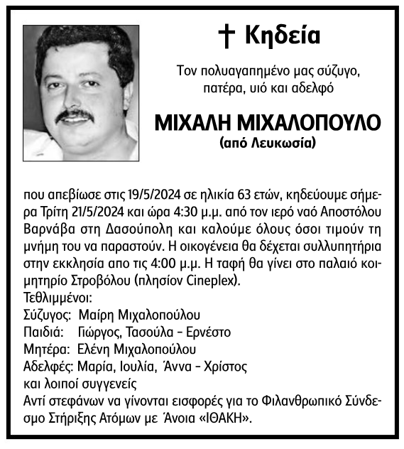 ΚΗΔΕΙΑ: ΤΡΙΤΗ, 21 ΜΑΪΟΥ 2024 ΚΑΙ ΩΡΑ 4.30 Μ.Μ ΣΤΟΝ ΙΕΡΟ ΝΑΟ ΑΠΟΣΤΟΛΟΥ ΒΑΡΝΑΒΑ ΣΤΗ ΔΑΣΟΥΠΟΛΗ, ΚΗΔΕΙΑ ΤΟΥ ΜΙΧΑΛΗ ΜΙΧΑΛΟΠΟΥΛΟΥ (ΣΥΖΥΓΟΥ ΜΑΙΡΗΣ ΣΤΑΥΡΟΥ ΑΠΟ ΤΟΝ ΚΑΡΑΒΑ), ΗΛΙΚΙΑΣ 63 ΕΤΩΝ.