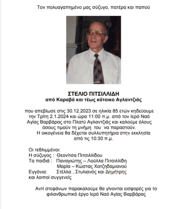 ΚΗΔΕΙΑ: ΤΡΙΤΗ 02/01/2024 ΚΑΙ ΩΡΑ 11.00 Π.Μ., ΣΤΟΝ ΙΕΡΟ ΝΑΟ ΑΓΙΑΣ ΒΑΡΒΑΡΑΣ ΣΤΟ ΠΛΑΤΥ ΑΓΛΑΝΤΖΙΑΣ, ΚΗΔΕΙΑ ΤΟΥ ΣΤΕΛΙΟΥ ΠΙΤΣΙΛΛΙΔΗ, ΗΛΙΚΙΑΣ 85 ΕΤΩΝ ΑΠΟ ΤΟΝ ΚΑΡΑΒΑ.