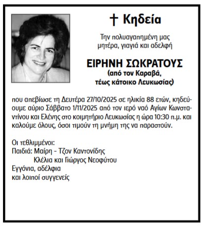 ΑΥΡΙΟ ΣΑΒΒΑΤΟ, 1 ΝΟΕΜΒΡΙΟΥ 2025 ΚΑΙ ΩΡΑ 10.30 Π.Μ. ΣΤΟΝ ΙΕΡΟ ΝΑΟ ΑΓΙΩΝ ΚΩΝΣΤΑΝΤΙΝΟΥ ΚΑΙ ΕΛΕΝΗΣ ΣΤΗ ΛΕΥΚΩΣΙΑ, ΚΗΔΕΙΑ ΤΗΣ ΕΙΡΗΝΗΣ ΣΩΚΡΑΤΟΥΣ ΑΠΟ ΤΟΝ ΚΑΡΑΒΑ, ΗΛΙΚΙΑΣ 88 ΕΤΩΝ.